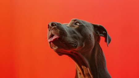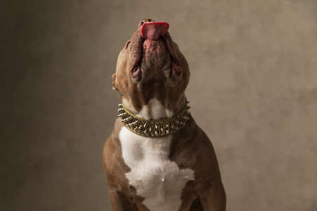 sweet american bully dog eager to reach something with his tongue on gray background