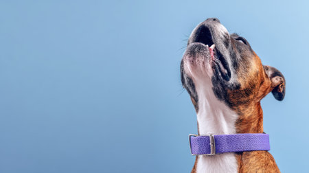 A close-up shot of a boxer dog with its head tilted up and mouth open, wearing a purple collar against a solid blue backdrop.