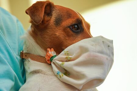 Small Jack Russell terrier dog wearing home made simple cotton mouth virus mask. Pets are not vulnerable to coronavirus covid-19 but some owners protect them nevertheless