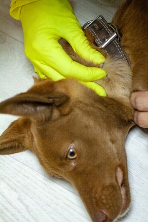 The vet doctor removes the Ixodes tick from a dog that has been bitten into the neck. Tick sucked to the skin of the dog. Mite drinks blood dog.