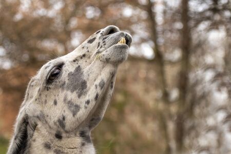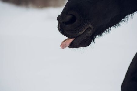 Friesian stallion horse shows the tongue winter