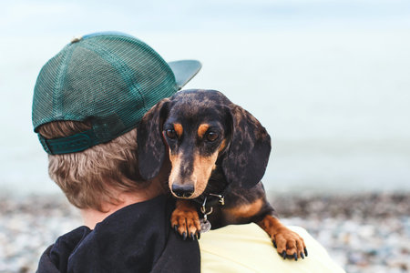 Cute dachshund dog resting on shoulder of man wearing green cap outdoors, small black tan puppy looking at camera, warm human animal bond, companionship travel lifestyle copyspace concept