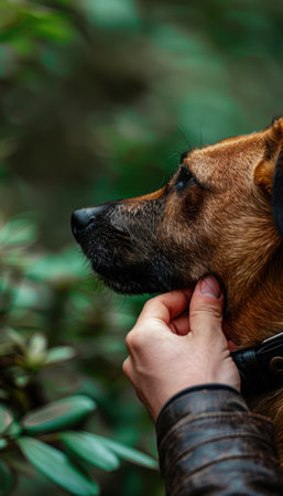 Hand secures a fashionable leather collar on a dog amidst lush, blurred greenery. the scene emphasizes the bond between pet and owner, showcasing natural textures and warm tones, suitable for pet care advertising or lifestyle blogging.