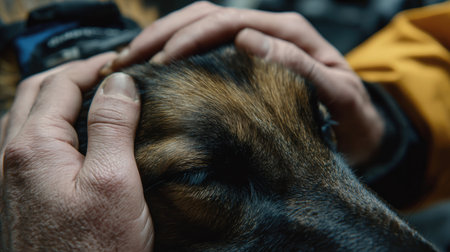 Owner care and help. Owner hand caresses a dog. Dog trust.