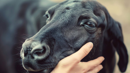 A person petting a black cow with their hand, AI