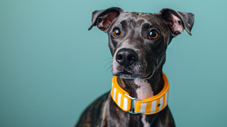 Studio shot of an American Staffordshire Terrier on yellow background.