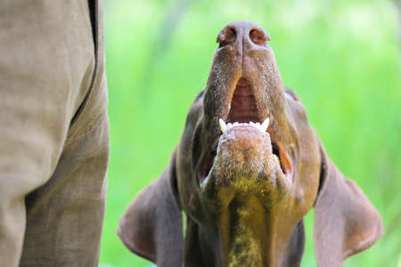 The obedient brown hound dog Drathaar breed looking up faithfully at master with open mouth. A hunter in brown pants trains a hunting puppy in green field, meadow. Summertime, green grass background.