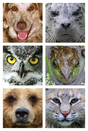 Animals collage with potamochoerus, otter, wallaby, maned and grey wolf, capybara, elephant, red panda, camel, hyena, snow leopard, lycaon, squirrel monkey, maki catta, giraffe, tiger portrait