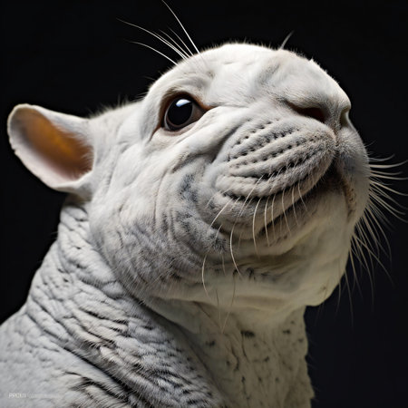 A close up of a primates wrinkled face, with a defined snout, looking directly at the camera. This terrestrial animal appears as a work of art in visual arts, resembling a painting