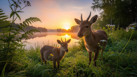 Deer on the bank of lake at sunrise in summer time.