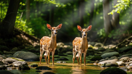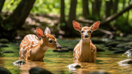 Two fawns standing in a stream and looking at the camera