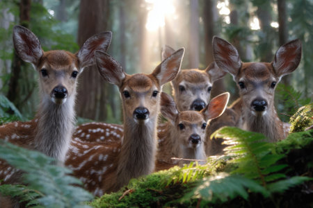 Five young deers stand closely together in a vibrant forest, illuminated by morning light.