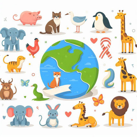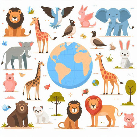 Animals on the planet. Vector illustration in flat design style.