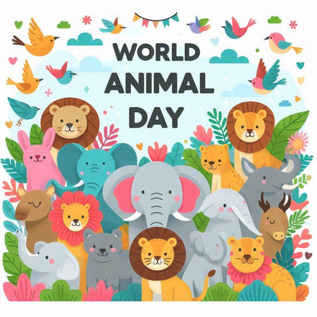 World Animal Day greeting card design with cute cartoon animals. Vector illustration.