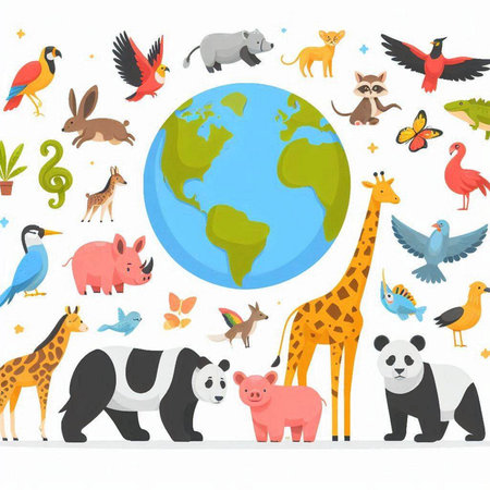 Vector illustration of wild animals on the background of the planet Earth.