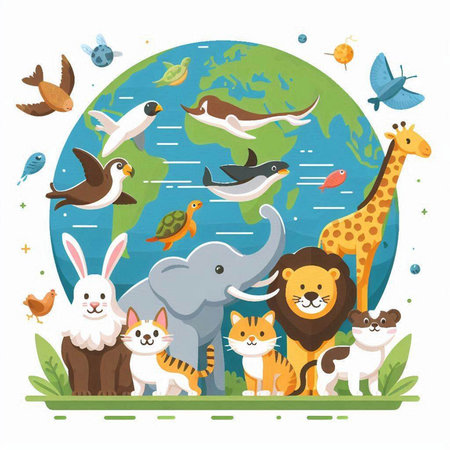 Animals on the background of the planet. Cartoon vector illustration.