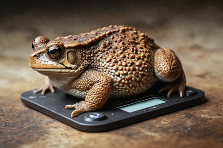 A whimsical juxtaposition of wildlife and measurement, featuring a frog perched quietly on a scale.