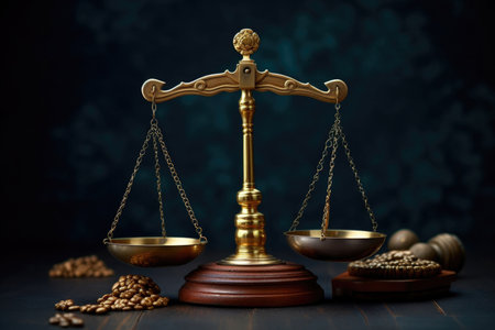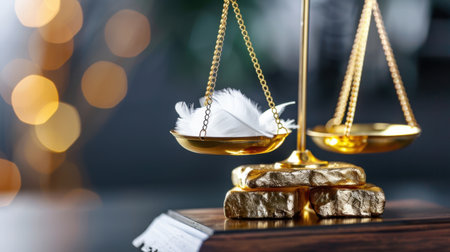 A striking image featuring golden scales of justice holding a delicate feather and shining gold ingots, symbolizing balance and fairness in society.