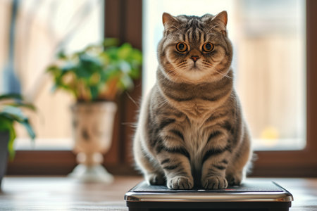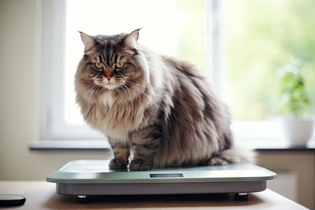 Fat Cat Sitting on Scales, Obesity Concept, Pet Overweight, Displeased Fluffy Kitty, Very Fat Cat, Generative AI Illustration