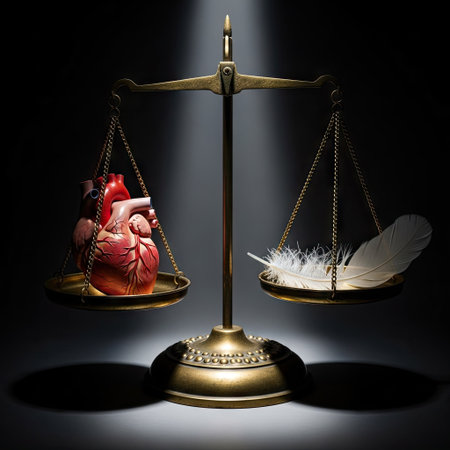 A golden balance scale displays a realistic human heart against a delicate white feather. The image utilizes dramatic lighting and a dark background. The contrast between the heart and feather suggests weight or value. Ideal for conceptual projects, editorial content, and various design applications.