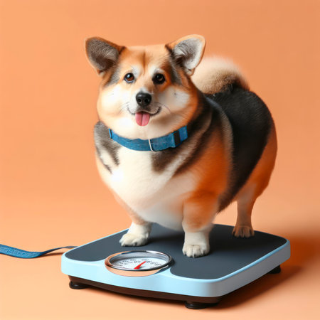 Weight monitoring concept. Overweight dog standing on weight scales. ai generative.