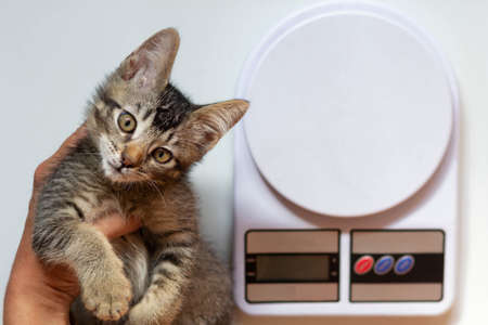 Top view of woman hand holding kitten and scales to know how much helminths medicine to give on the white background