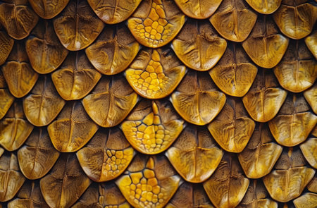 This close-up showcases a repeating pattern of golden scales. The texture is detailed with circular shapes overlapping each other. The warm lighting highlights the surface, suggesting a potential background element. It could be useful for various applications like design projects or textures.