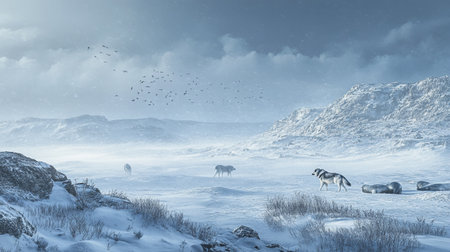 Fantasy winter landscape with wolfs. 3D Rendering.