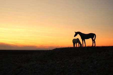 horse lighed by sunset sky