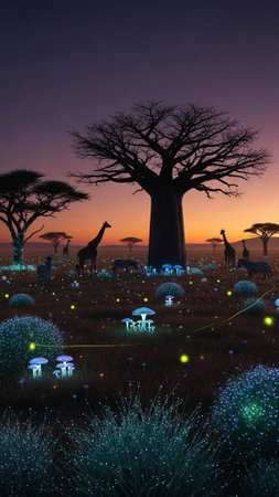A serene savannah landscape at sunset with various African animals