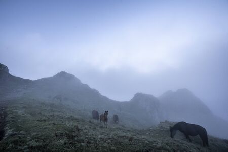 Free horses at the top with a lot of fog of the Peñas de Aya mount or also called Aiako Harria, Oiartzun. Gipuzkoa Province of the Basque Country