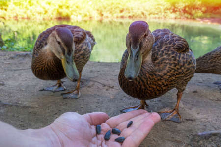 A man feeds wild ducks seeds from his hand by a pond in a city park. The concept of nature protection.
