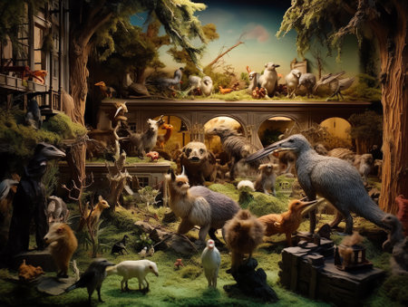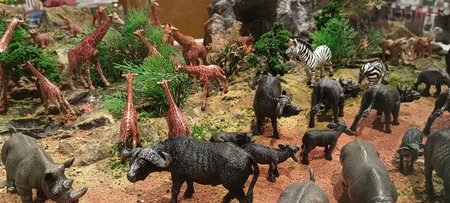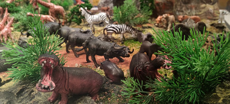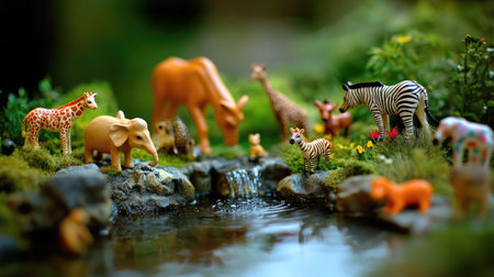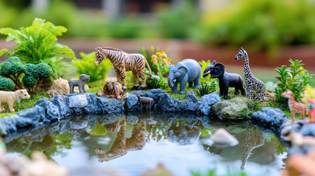 A charming miniature jungle scene featuring vibrant animal figurines by a tranquil water source, showcasing nature