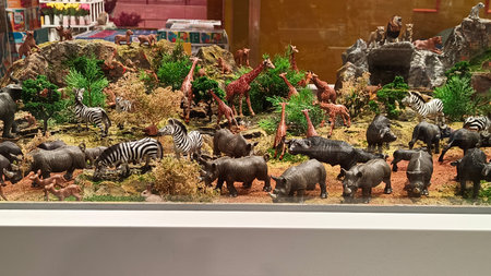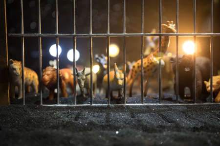 A group of animals inside a cage miniature. Wild animals in the zoo concept. Burning colorful background. Selective focus.