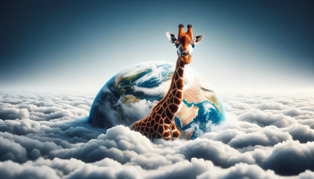 A figurative image of a giraffe standing on the Earth, stretching its neck above the clouds and looking at the horizon. The clouds are soft and wavy, contrasting with the detailed texture of the giraffe's fur.
