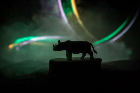 Silhouette of a Rhino miniature standing at foggy night. Creative table decoration with colorful backlight with fog. Selective focus
