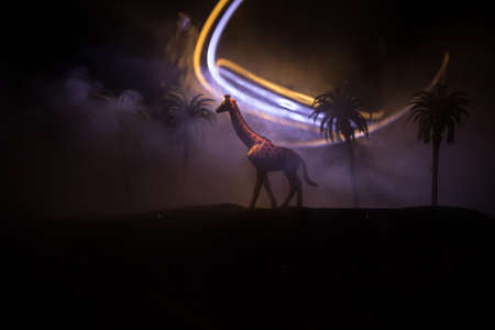Silhouette of a giraffe miniature standing at foggy night. Creative table decoration with colorful backlight with fog. Selective focus