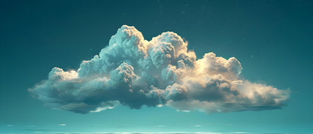 Fluffy cloud floating in clear blue sky, illuminated by warm sunlight, creating serene and peaceful atmosphere. soft edges and varying shades of white and gray enhance its beauty