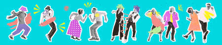 Timeless rock-and-roll. Contemporary art collage. Dancing couples in retro 70s, 80s styled clothes over bright background with drawings. Concept of art, music, fashion.