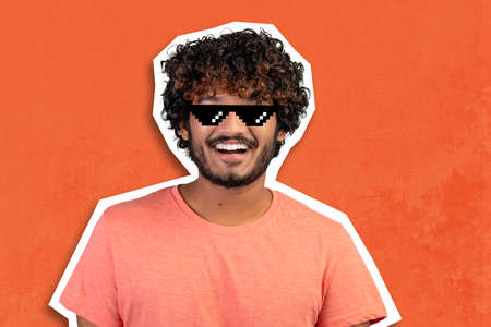 Portrait of young Indian man dressed casually looks at camera with light smile in neon light against gradient orange background. Concept of human emotions, diversity, youth, modernity. Ad