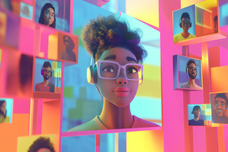 A colorful grouping of virtual figures highlights teamwork in a remote setting. They showcase diverse hairstyles and outfits, with a prominent figure in a digital frame at the center.