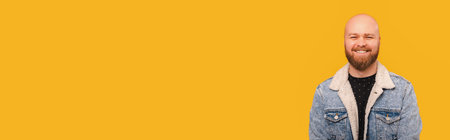 Banner size portrait of a handsome bald young man wearing jeans jacket.
