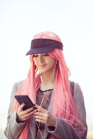 Japan anime cosplay. Colorful portrait of a young attractive smiling Asian woman in a coat with creative make-up wearing a pink wig. Trendy Japanese girl using smartphone listening music in earphones walking on the city street.