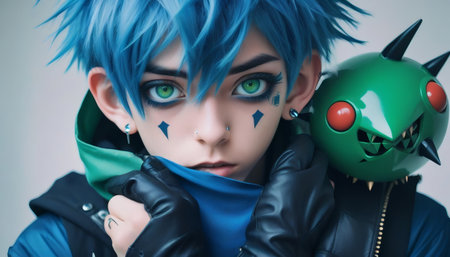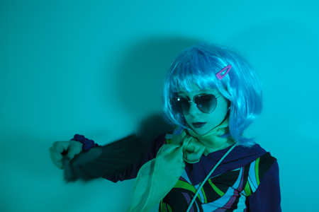Portrait of a girl with blue hair and green eyes in a cosplay costume