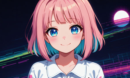 Vibrant anime girl with pink hair and glowing blue eyes smiles warmly against a futuristic neon-lit night background, capturing the essence of joyful cyberpunk fantasy in stunning