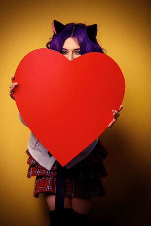 Portrait of a student girl with purple hair and cat's ears holding red heart on a yellow background. Japanese style anime.