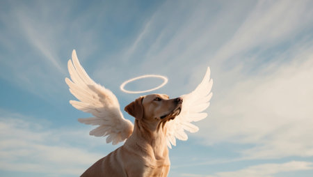 AI Generated. A dog with angel wings and a halo outdoors on a sunny day