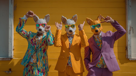 Group of dogs in colorful clothes and sunglasses on yellow wooden background.