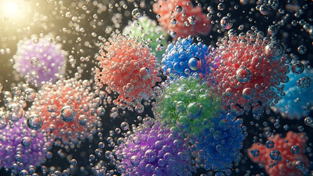 Bubbles and colorful molecular structures float in a vivid abstract scientific illustration.