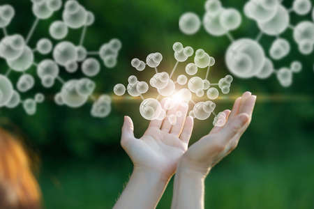 Cosmetics background, pastel Molecules, science background, lab background, herbal leaves, beauty products, bubbles background,Abstract Chemistry generative ai illustration